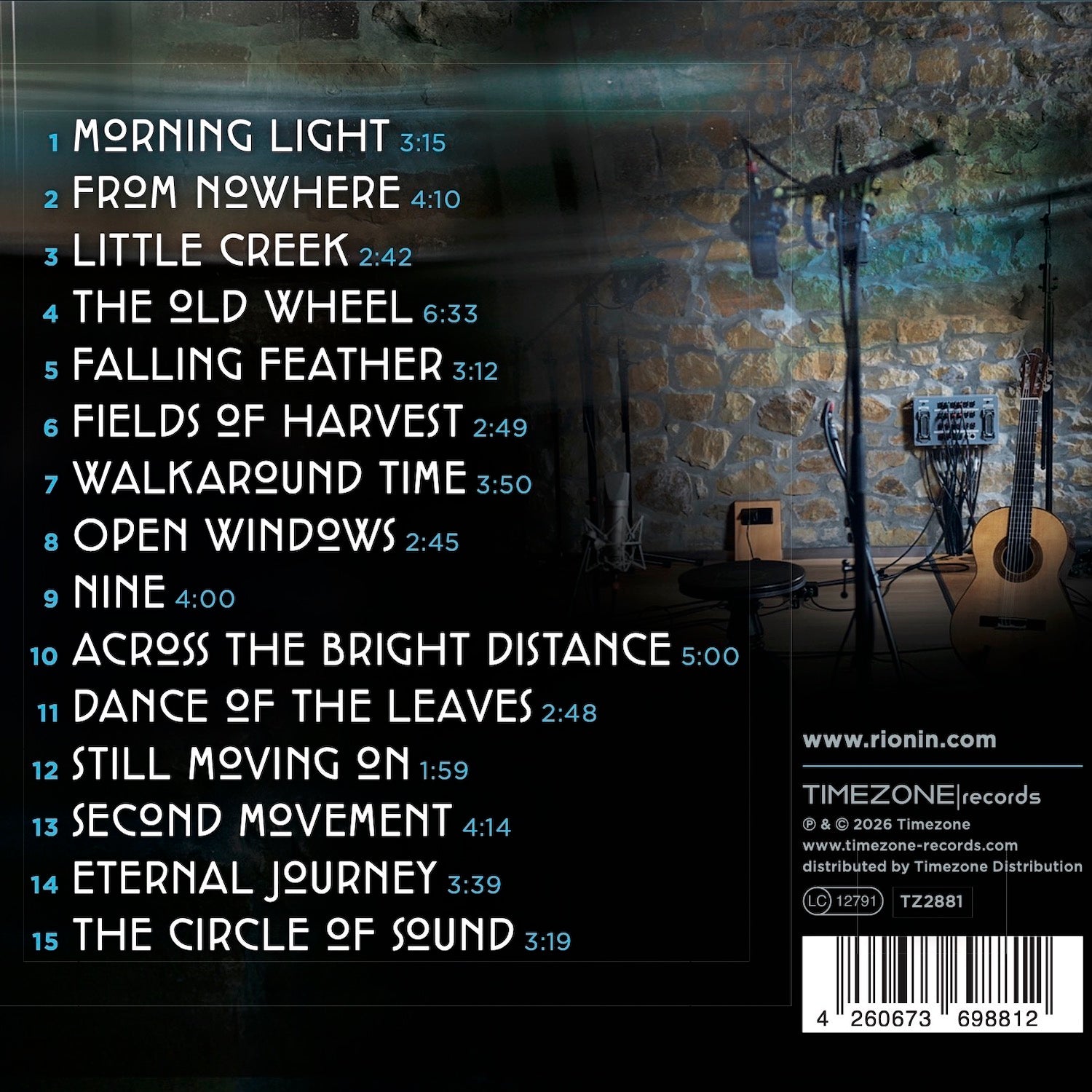 01 Morning Light 02 From Nowhere 03 Little Creek 04 The Old Wheel 05 Falling Feather 06 Fields of Harvest 07 Walkaround Time 08 Open Windows 09 Nine 10 Across the bright Distance 11 Dance of the Leaves 12 Still Moving On 13 Second Movement 14 Eternal Journey 15 The Circle of Sound